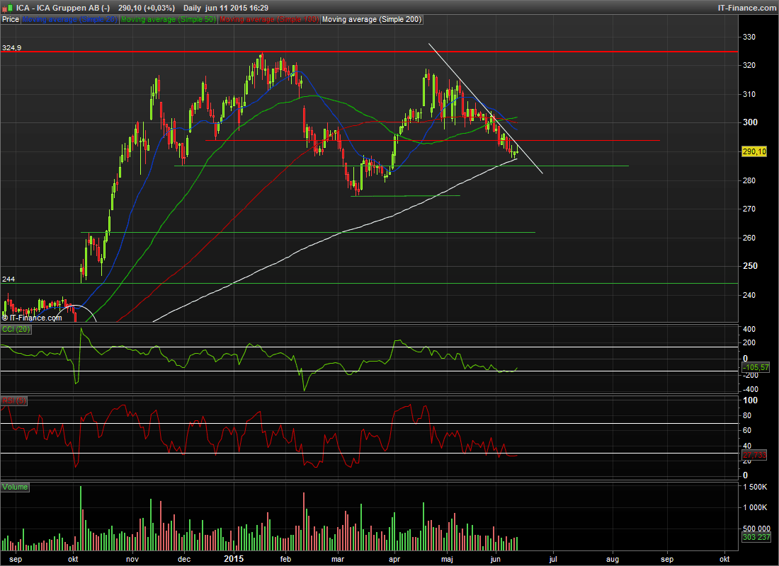 Hos ICA befinner sig kursen istället precis strax ovanför MA200 och detta MA som ofta används som stöd kan ge kursen en uppstuds. Bryter ICA upp genom den kortsiktigare fallande trendlinjen kan det tolkas som en köpsignal.