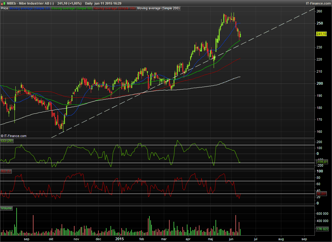 Nibe ligger vid en stödzon som agerar av MA50 (glidande medelvärde 50 dagar) samt en stigande trendlinje. CCI och RSI har fått en skjuss ner till översålda nivåer och detta kan agera som köpsignal.