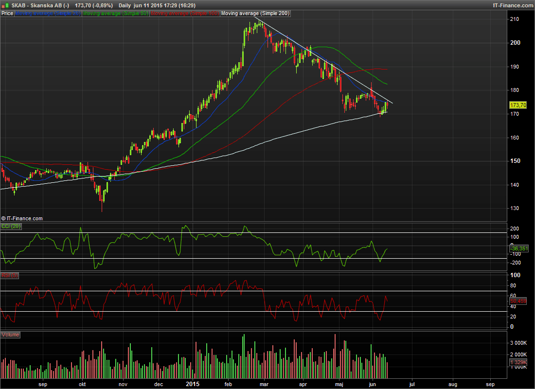 Även Skanska ligger och lutar sig mot 200 dagars glidande medelvärde och kursen har dessutom en negativt lutande trendlinje över sig. Bryter kursen upp genom denna kan det vara ett entryläge då MA200 kan ge en ”studseffekt”.