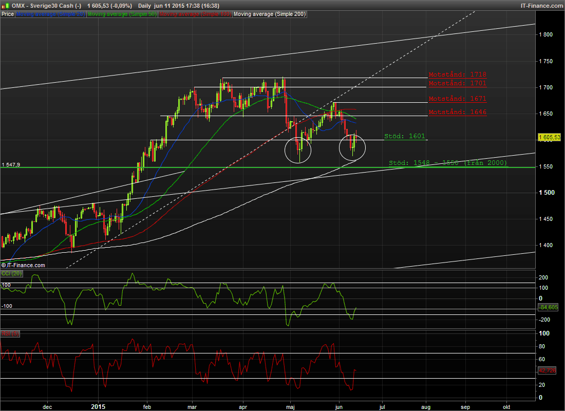 OMX ger oss en doji-candle även idag vilket kan indikera på viss oro och osäkerhet för en positiv rekyl. För att denna rekyl ska vara äkta vill vi nog helst se att det kortsiktigare MA20 vänder uppåt. Bryter OMX ner genom MA200 bör man avvakta. Vid detta område är det dock en stark stödnivå av flertalet indikatorer. Men man ska som alltid vara försiktig!
